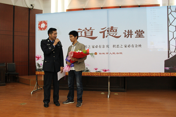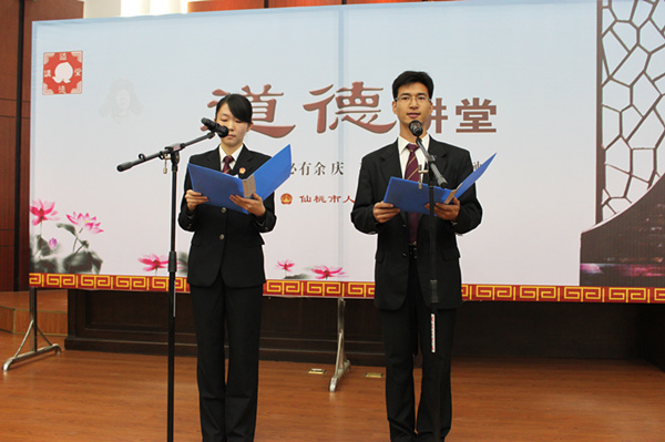 10月31日下午,仙桃法院举办第三期道德讲堂,“唱一首歌曲,看一部短片,朗诵一首诗歌,诵一段经典,谈一段感悟”。此次活动以“弘扬见义勇为,传承雷锋精神”为主题,该院全体干警共160余人参加了活动。